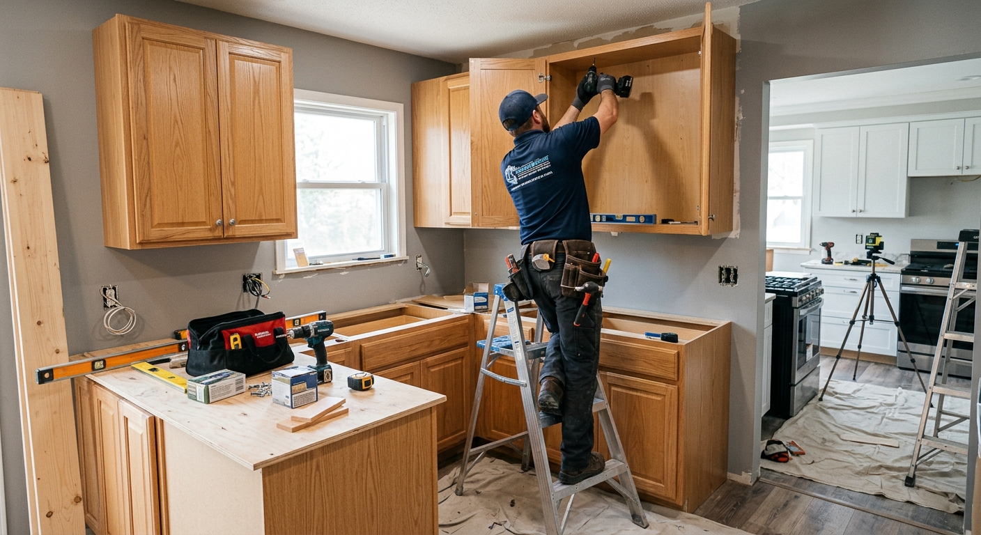 Our contractors work with top cabinet lines — KraftMaid, Merillat, Waypoint, Medallion — and top countertop brands. All work backed by a written workmanship warranty.